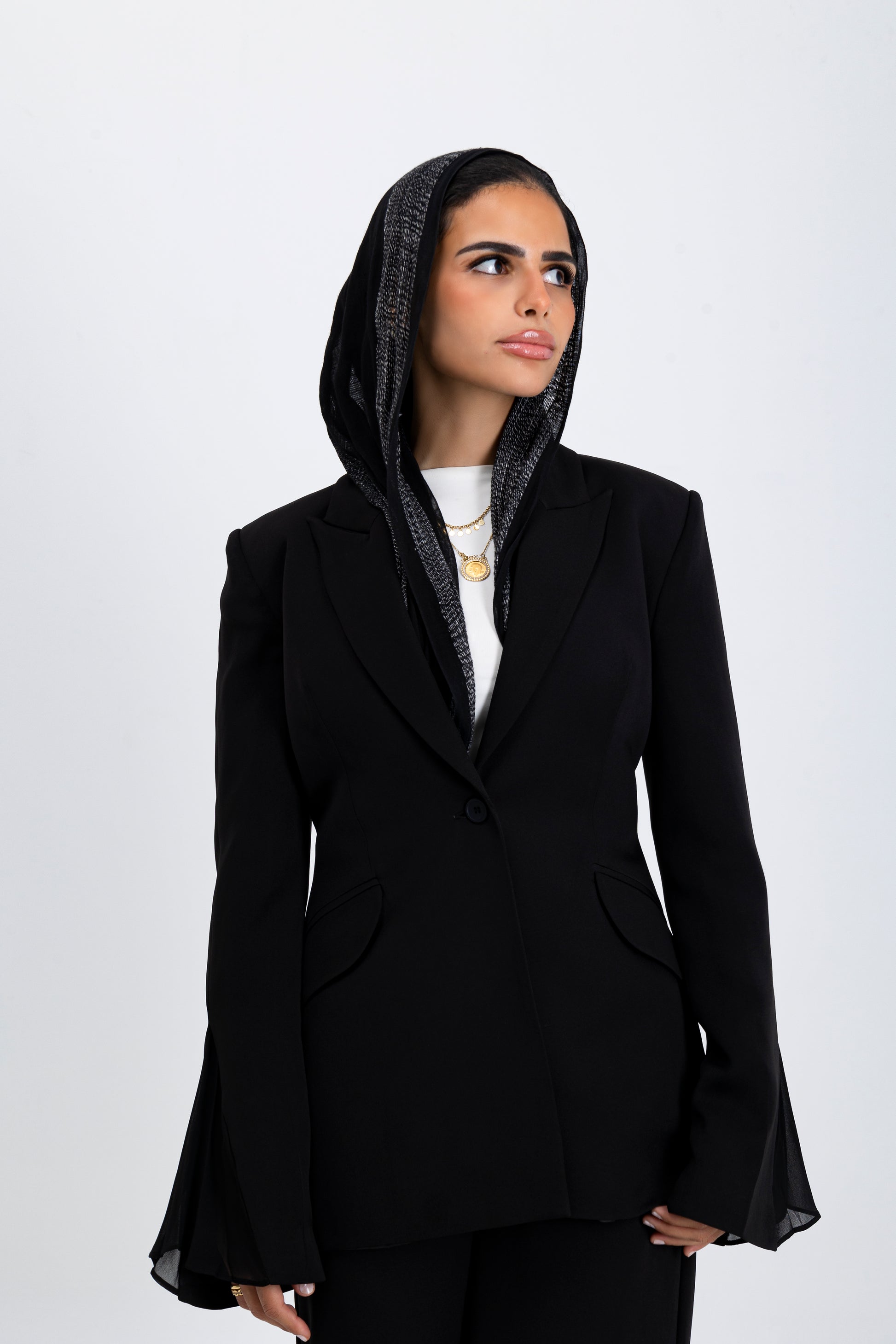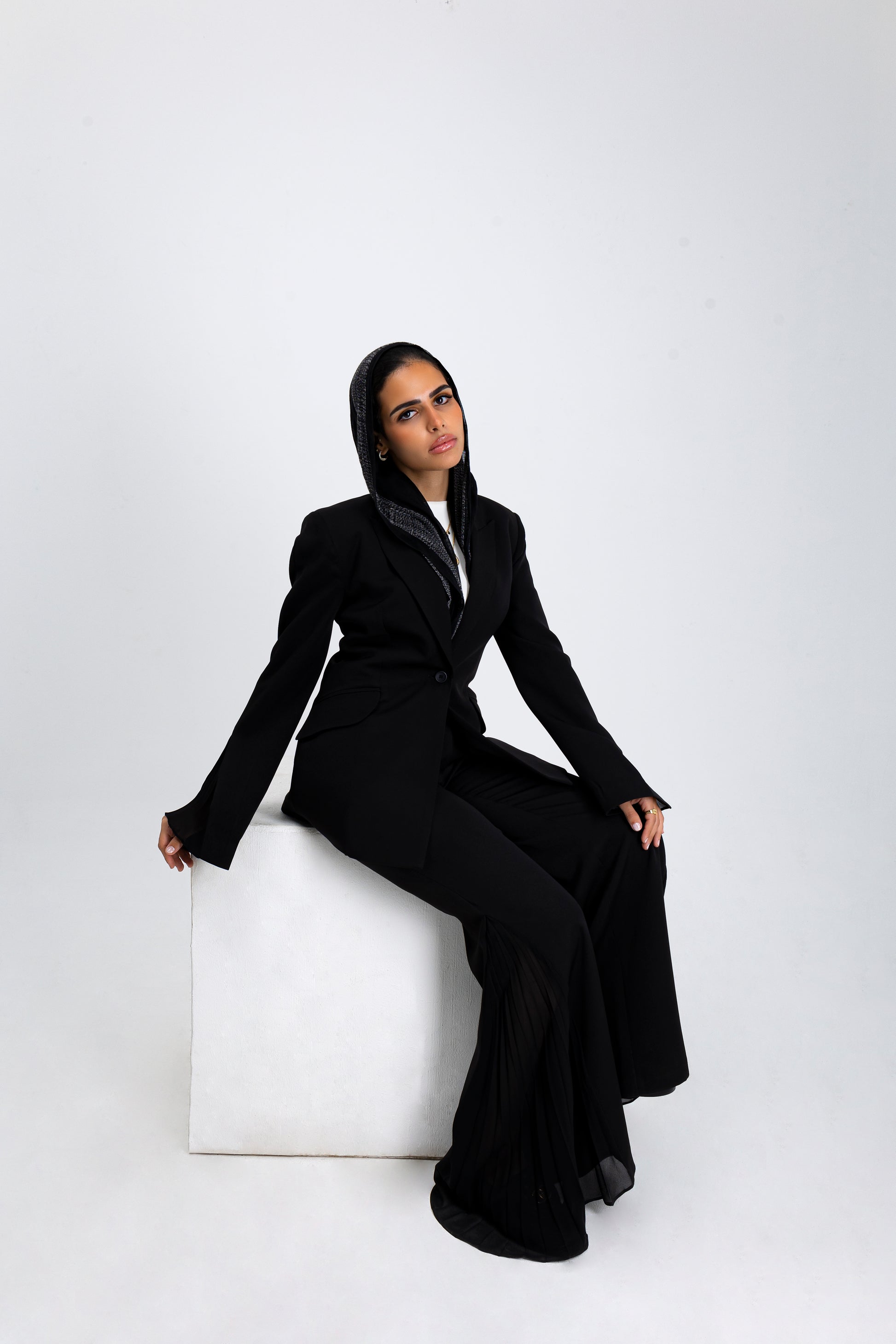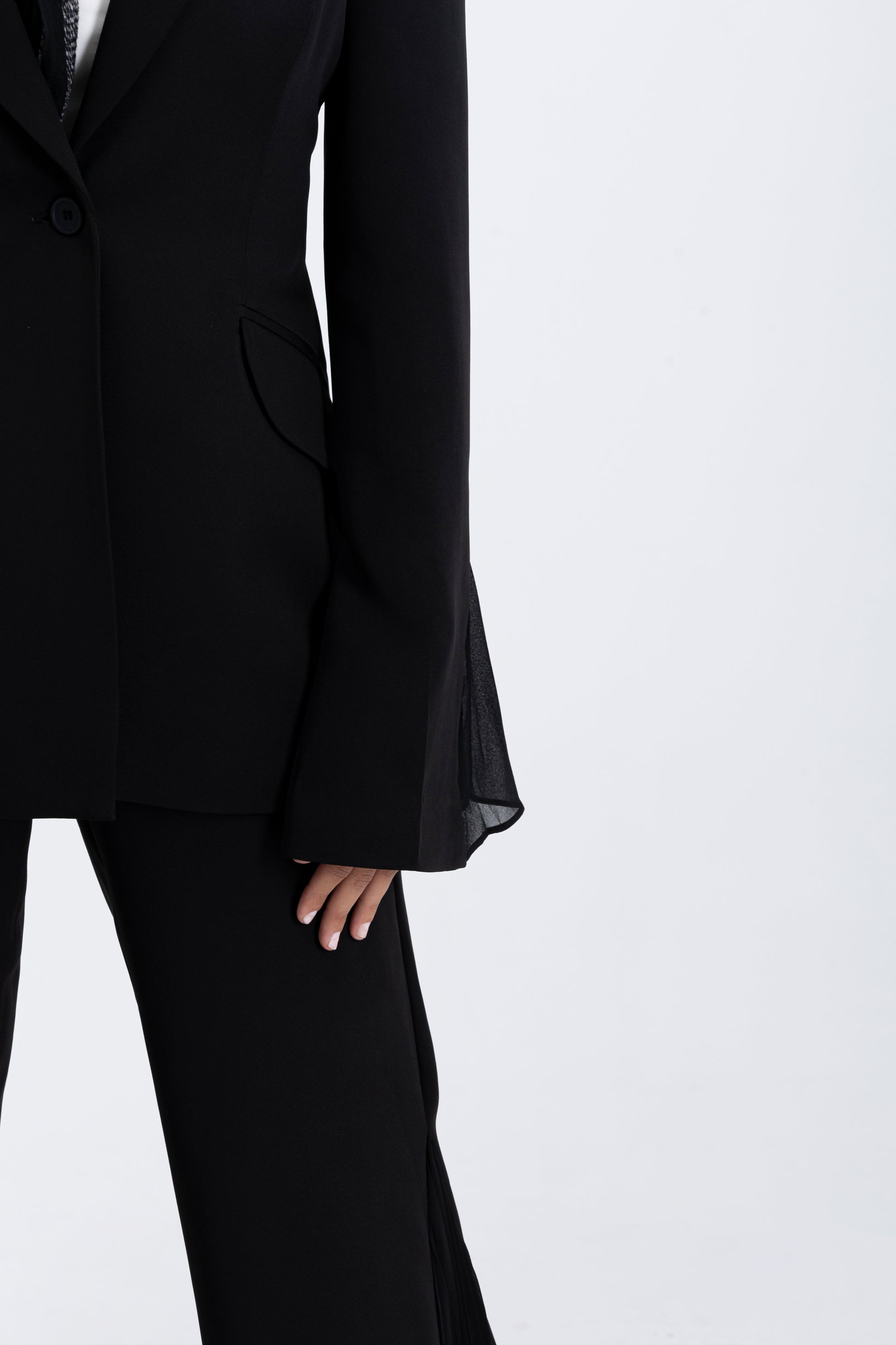Sophisticated and versatile, She is Professional features a tailored blazer with pleated cuff details and matching trousers. This black suit combines elegance and confidence, perfect for making a statement from office hours to evening events.