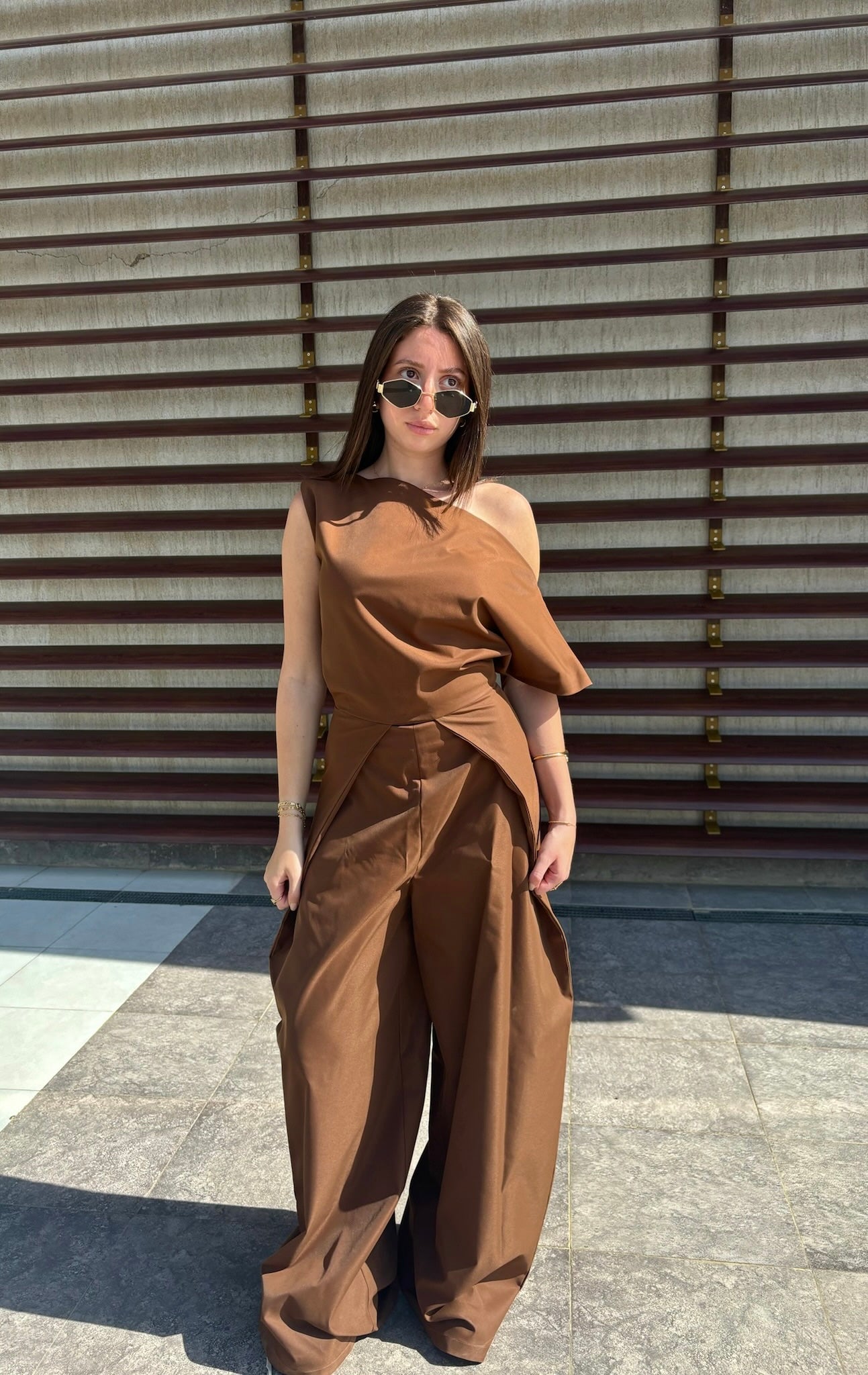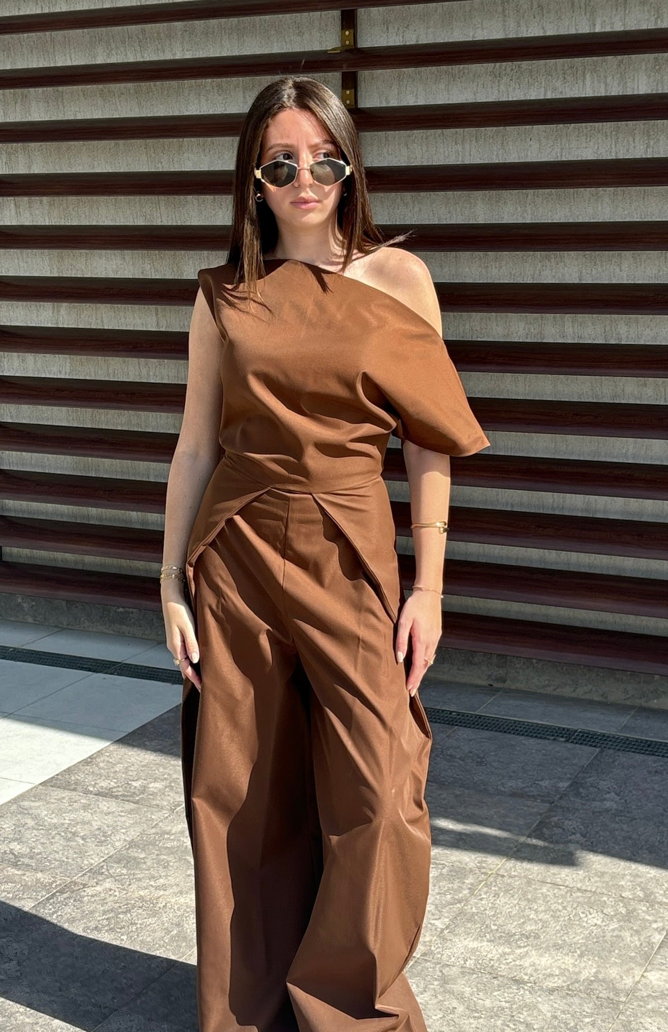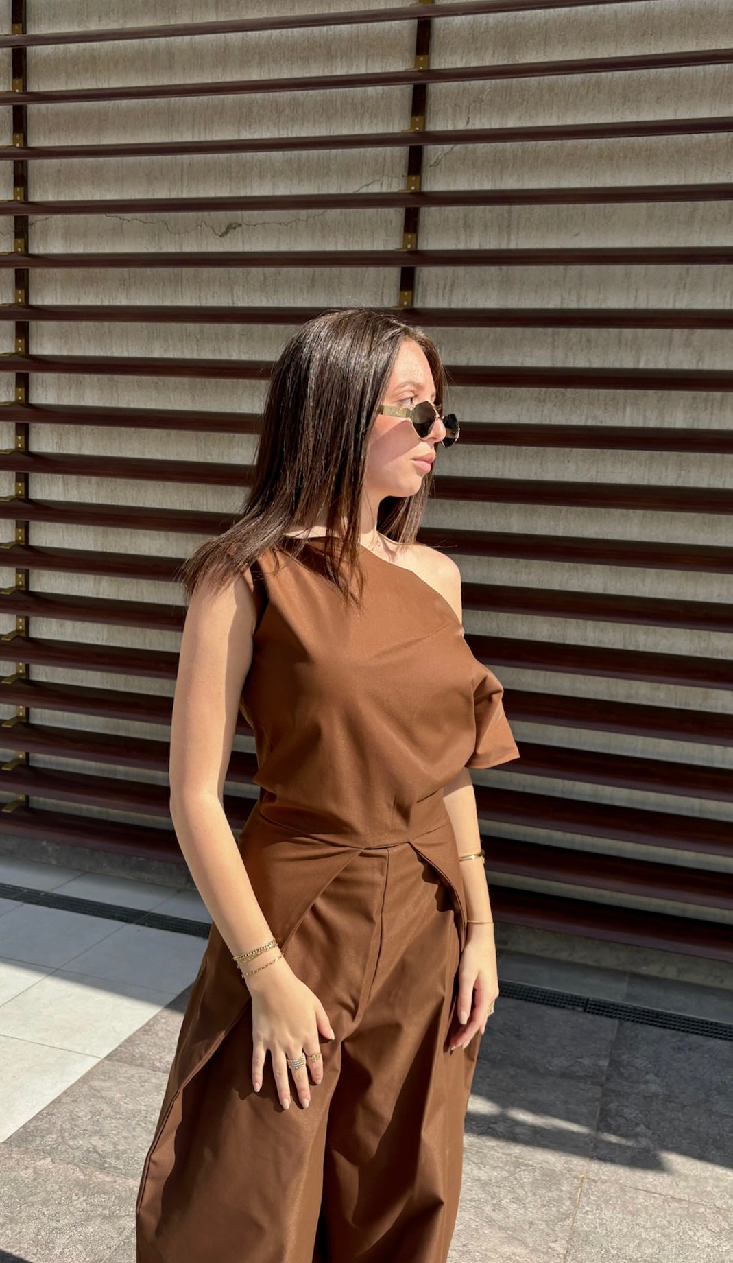 An effortlessly chic look with its soft beige tone and structured silhouette. This piece features an elegant asymmetrical neckline that drapes across one shoulder, adding a subtle sophistication. With a fitted waist and flowing wide-leg pants, it's perfect for both day and evening wear, this jumpsuit combines comfort and elegance with ease