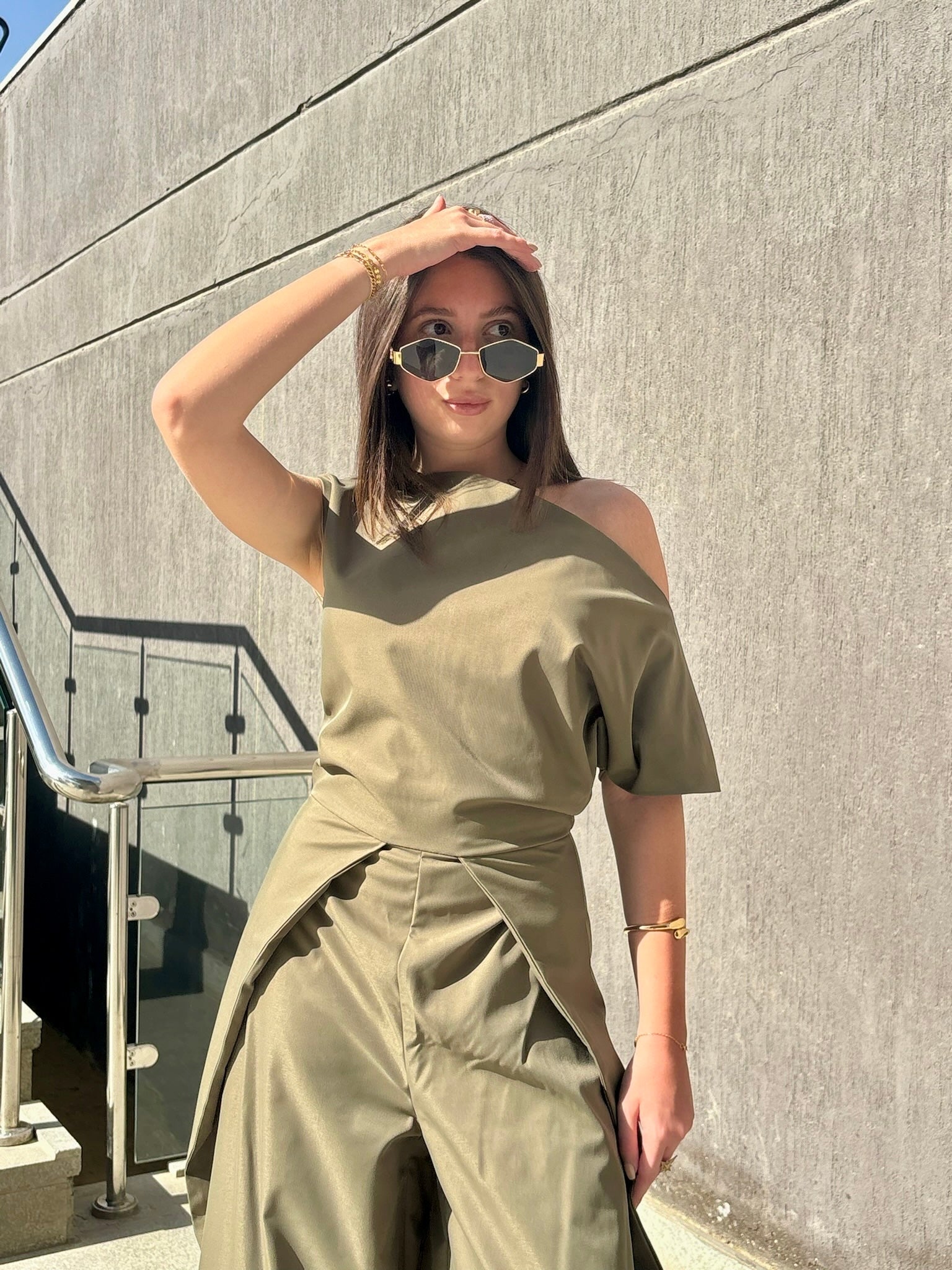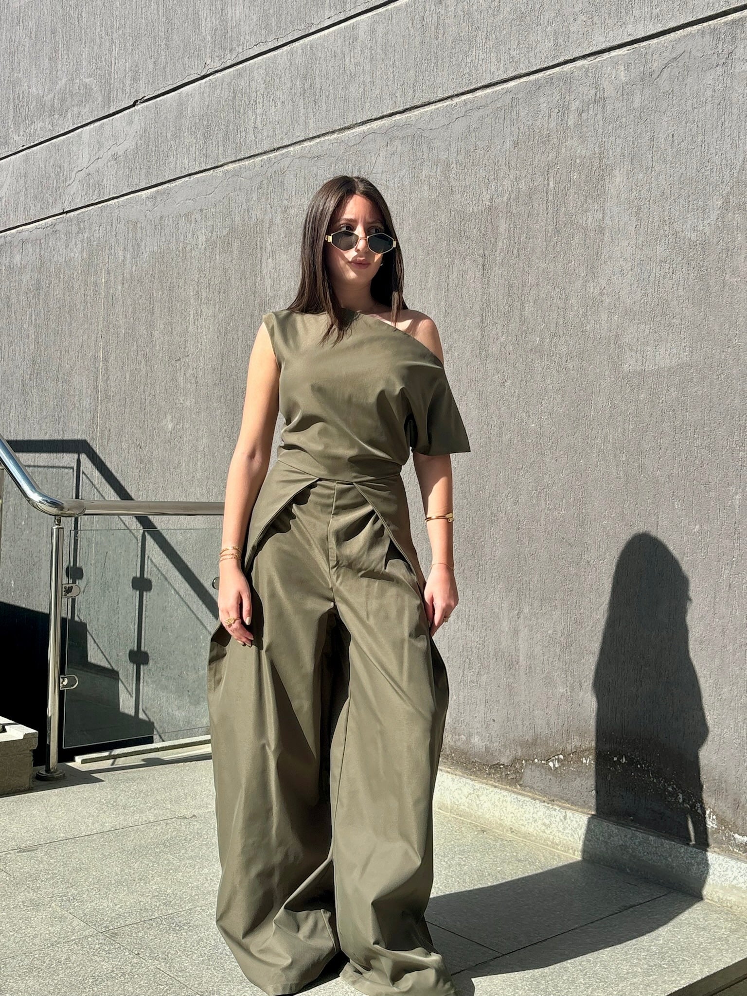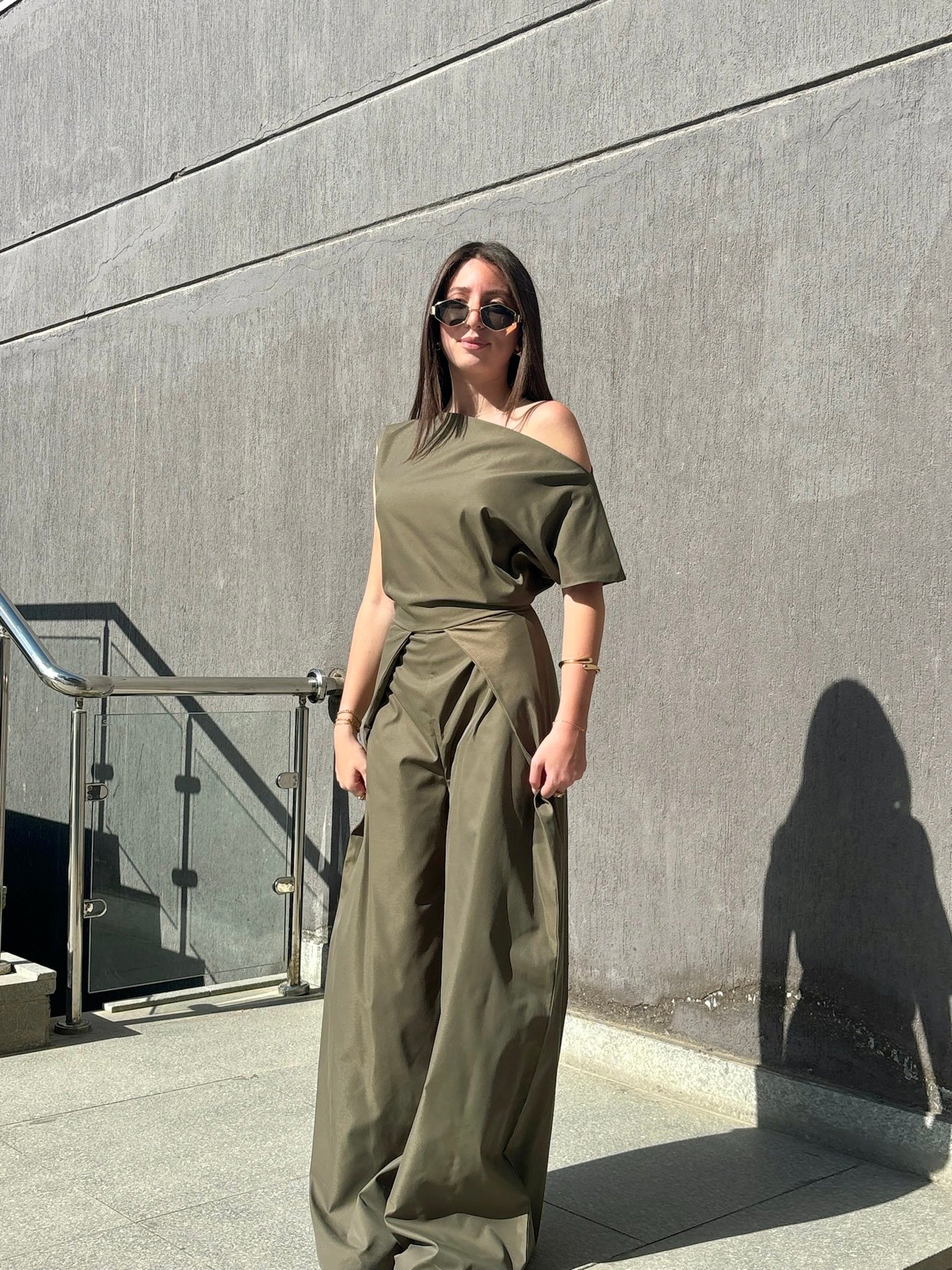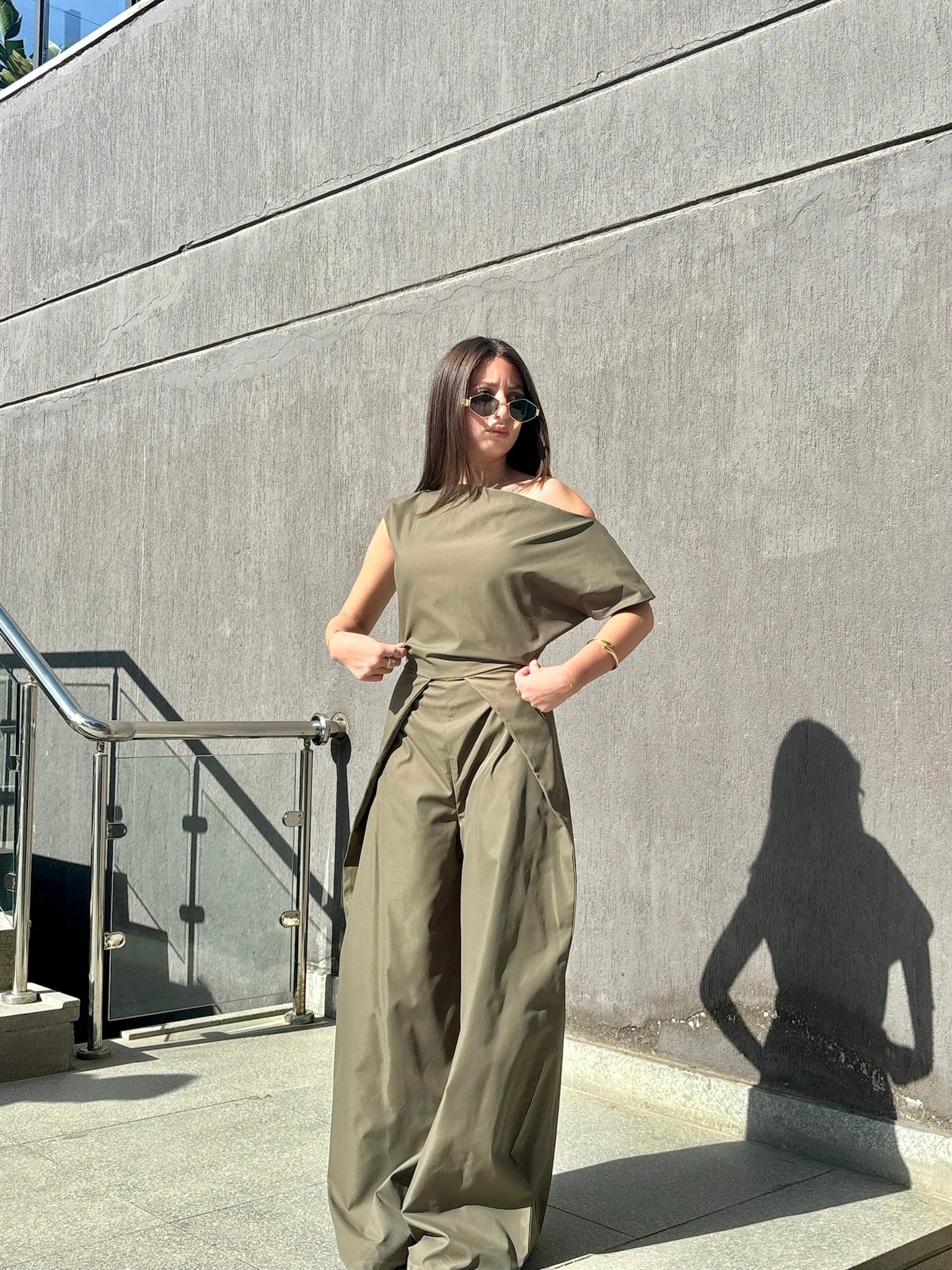 An effortlessly chic look with its soft beige tone and structured silhouette. This piece features an elegant asymmetrical neckline that drapes across one shoulder, adding a subtle sophistication. With a fitted waist and flowing wide-leg pants, it's perfect for both day and evening wear, this jumpsuit combines comfort and elegance with ease