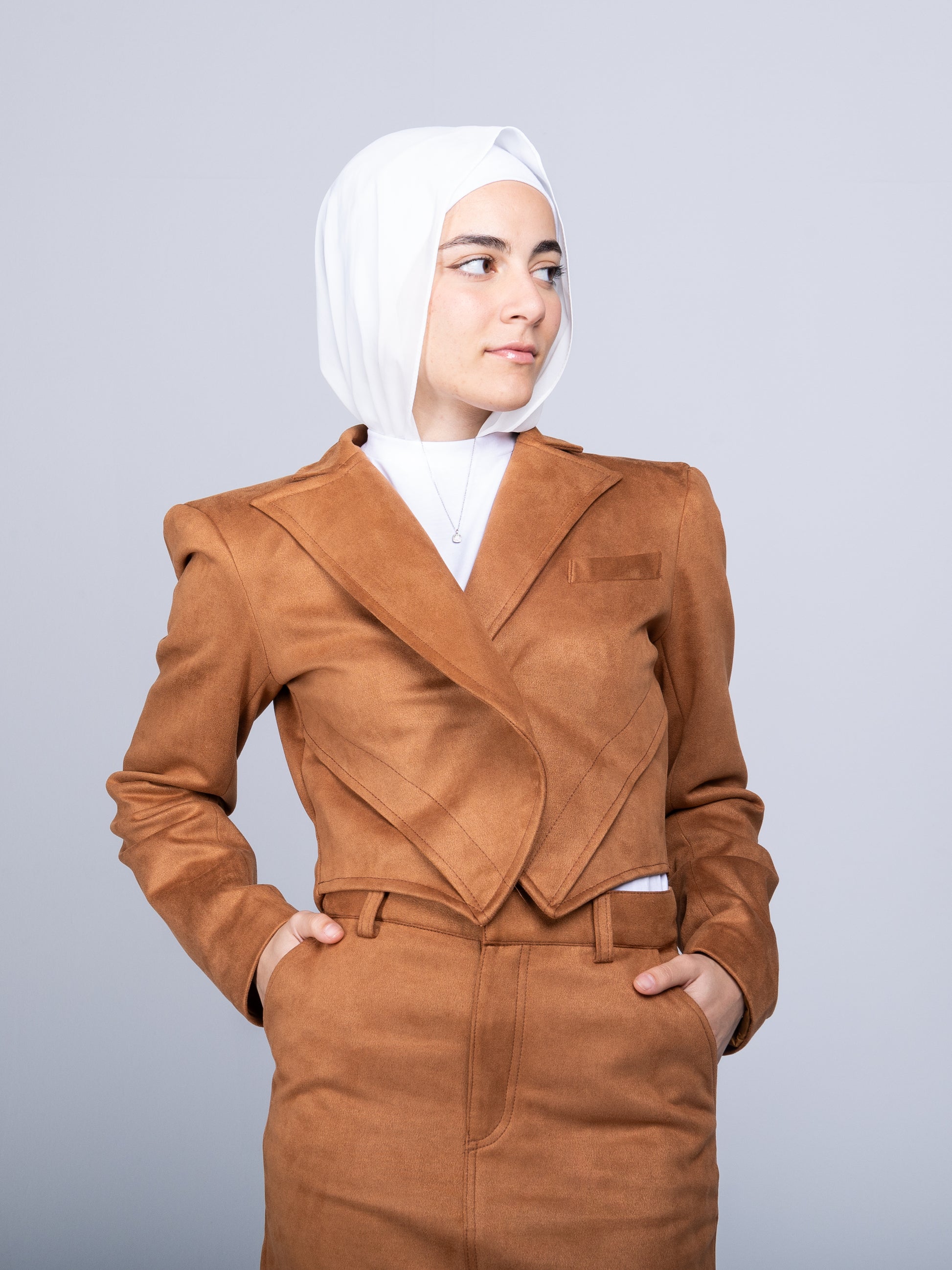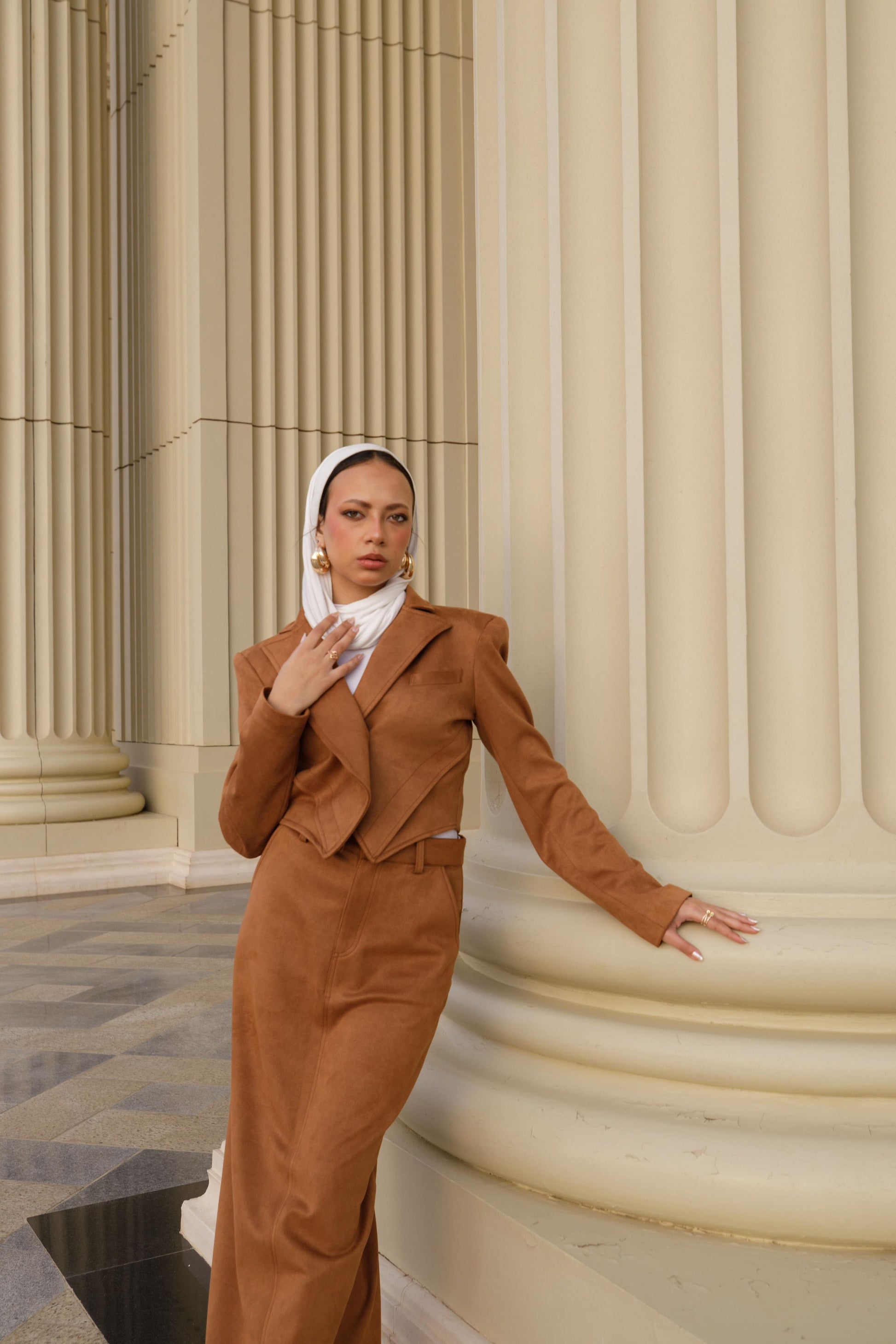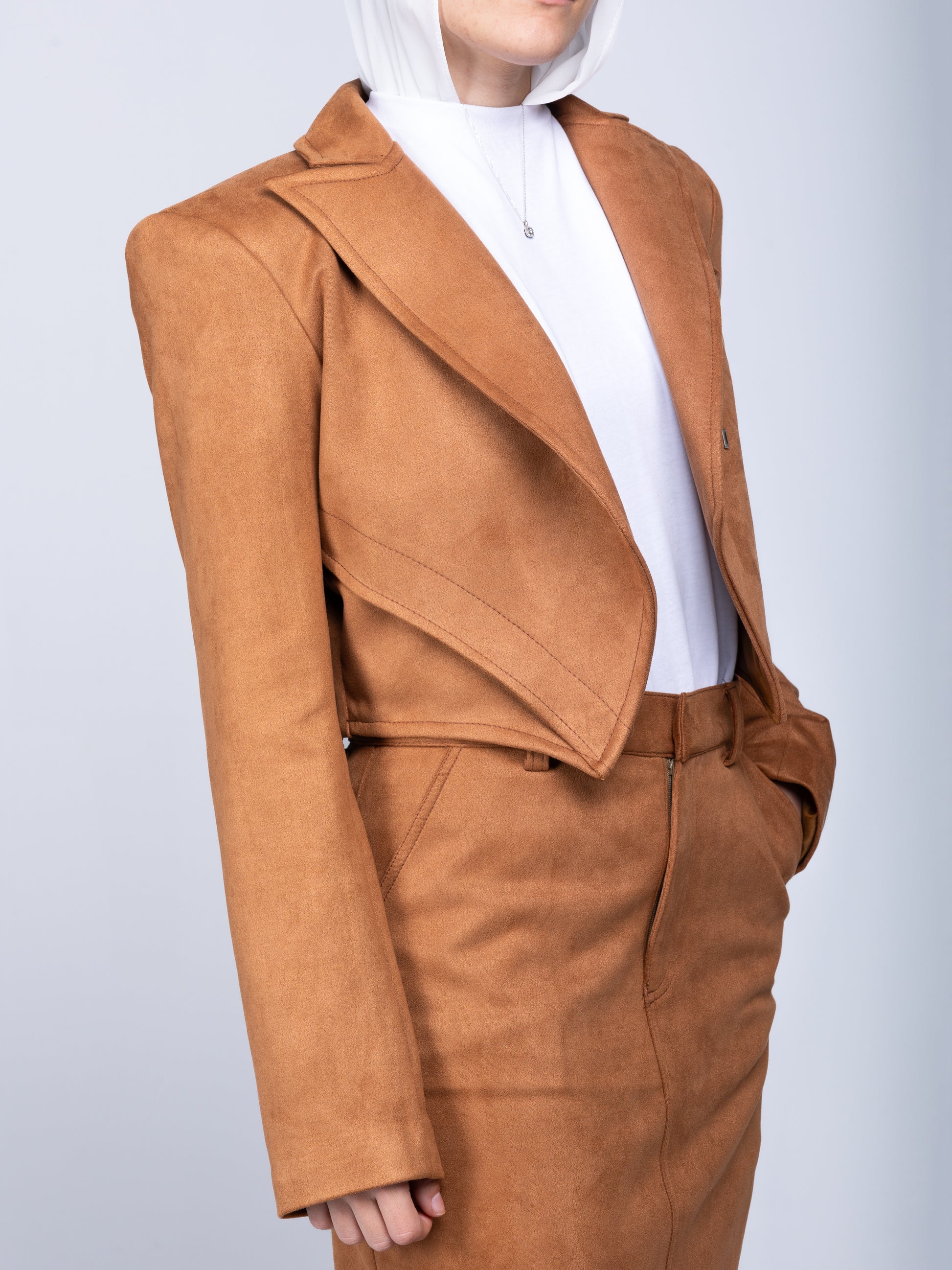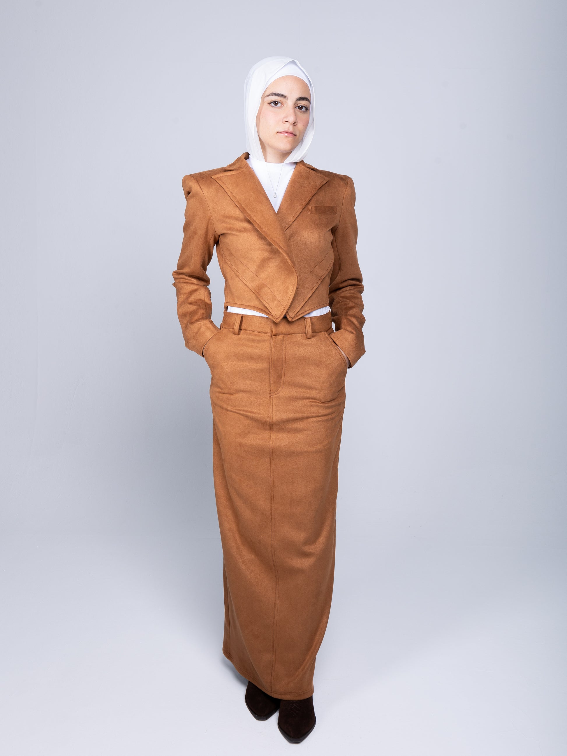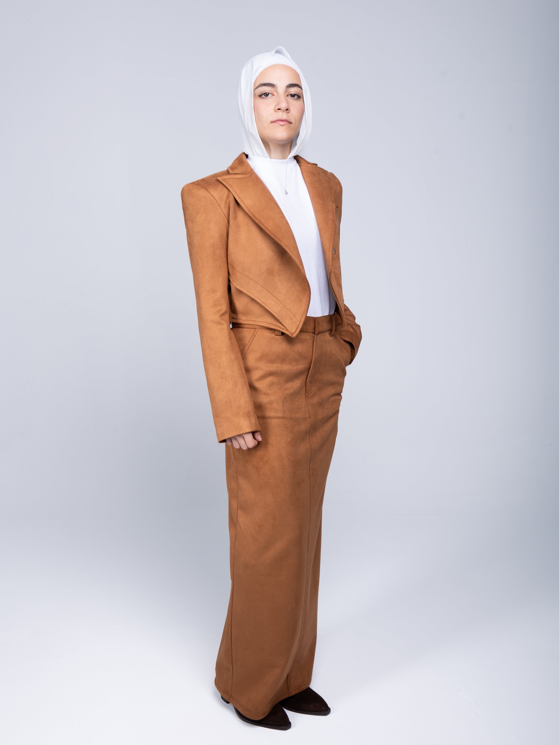 This camel suede set offers a perfect balance of elegance and bold structure. The floor-length maxi skirt features a flattering straight fit, while the cropped blazer steals the show with its strong padded shoulders and intricate stitching detail. The blazer’s structured, asymmetric silhouette creates a dynamic, almost three-dimensional look, adding character and depth to the ensemble. This set is a striking combination of sophistication and standout style.