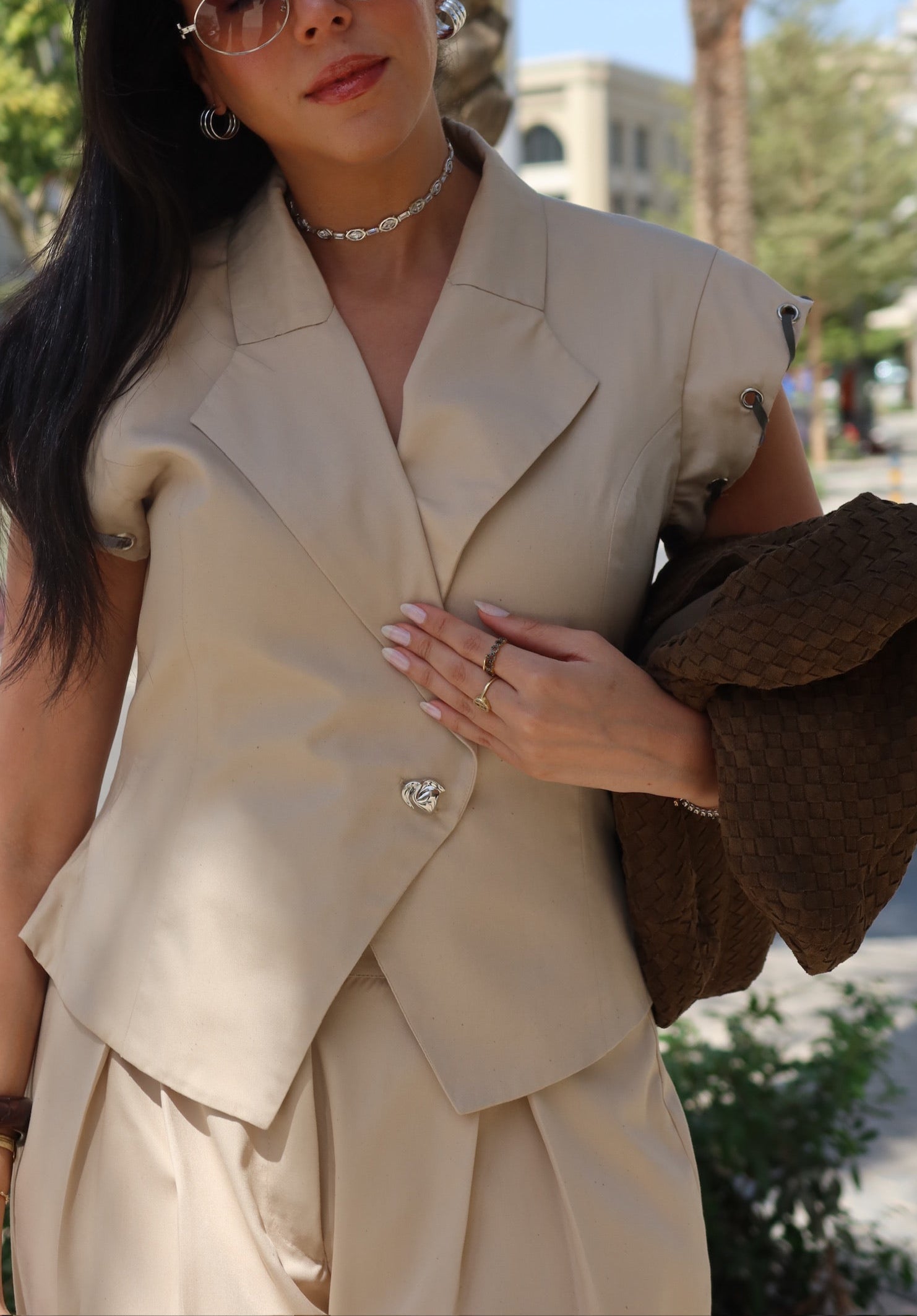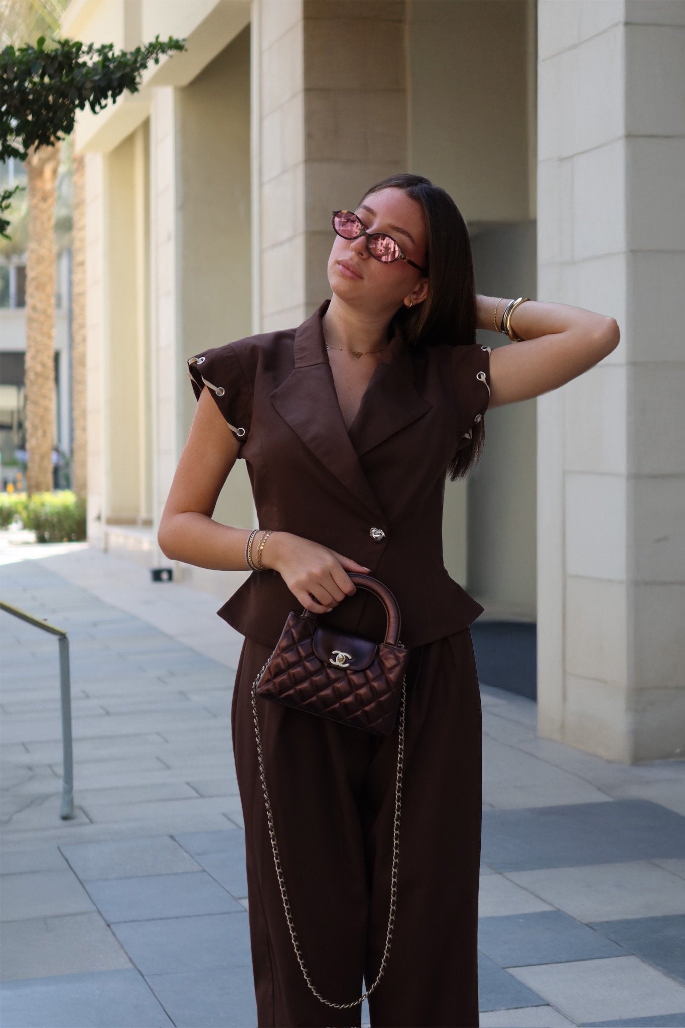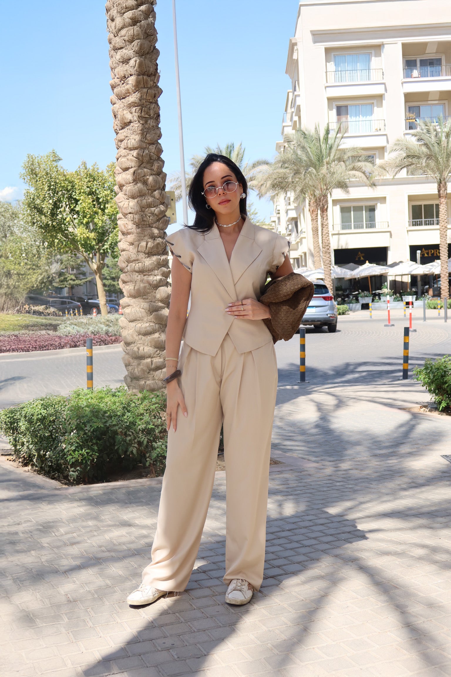 Sophisticated yet effortless, The Cross Set redefines power dressing with a modern edge. The tailored vest features structured shoulders and eyelet detailing threaded with leather straps, adding a bold, refined contrast to its feminine shape. Subtle pleats at the top of the trousers enhance the silhouette, creating a polished look that balances structure and fluidity. This set transitions seamlessly through the season — versatile, confident, and timeless.