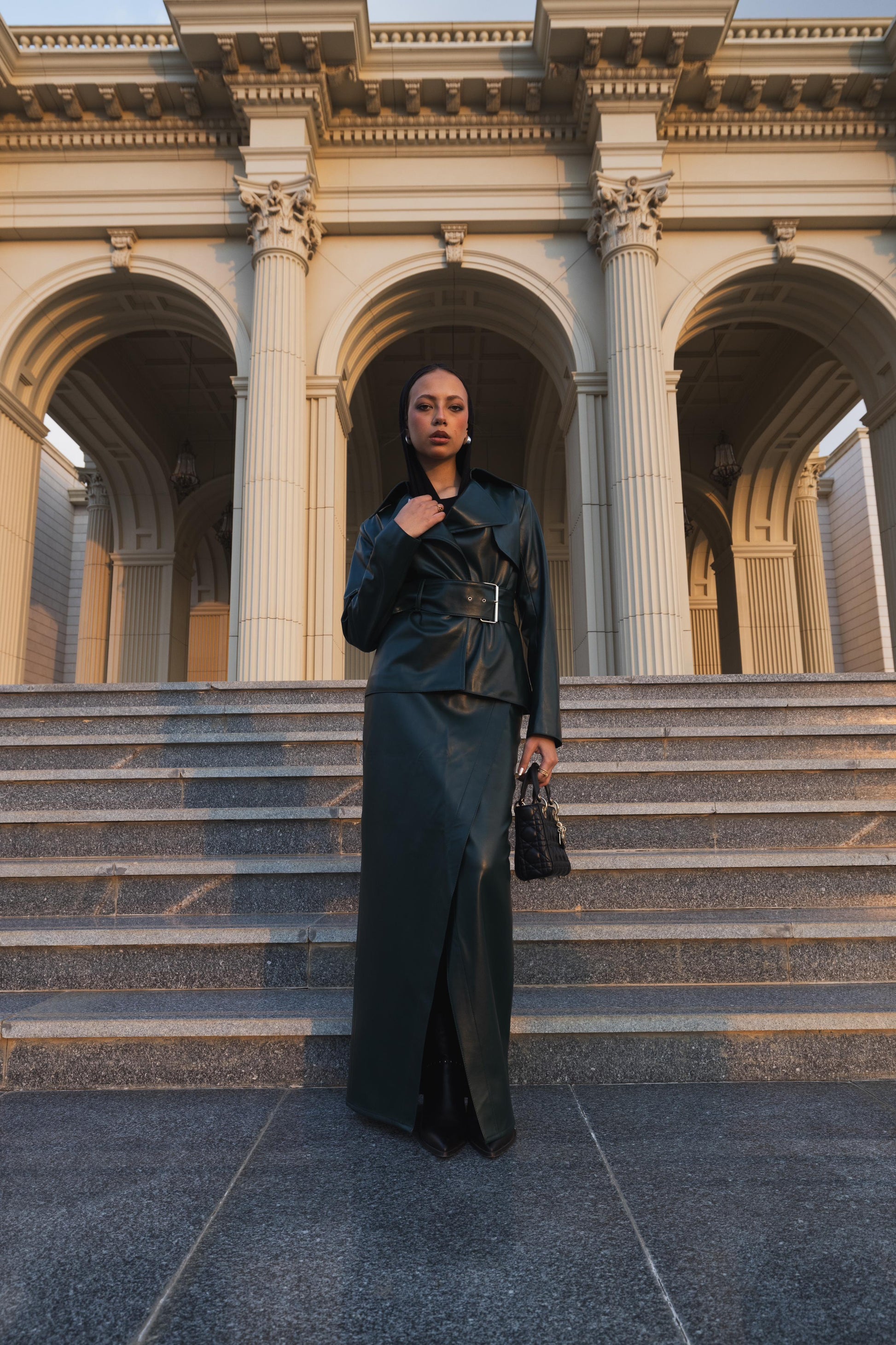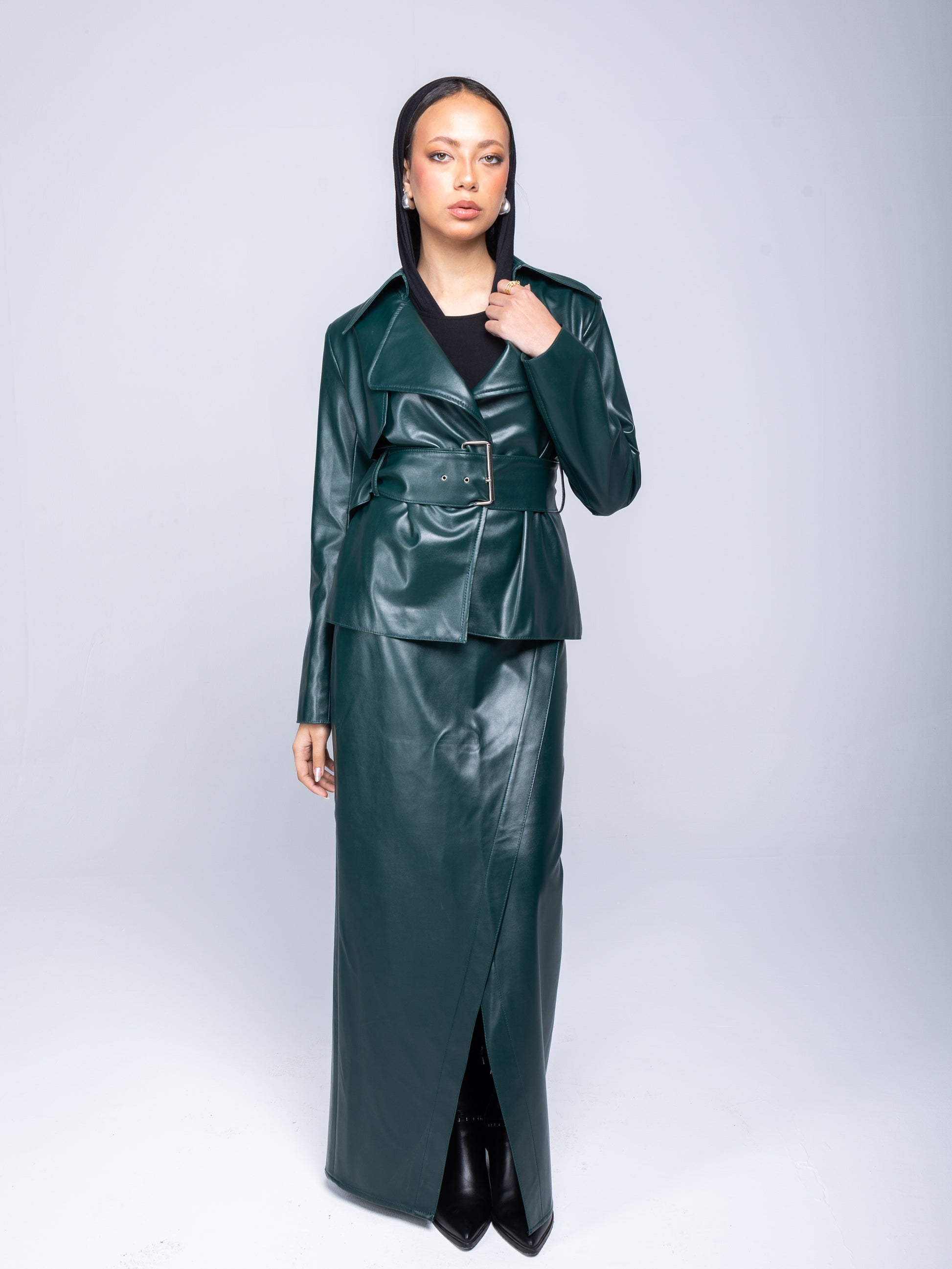 Crafted from rich emerald green leather, this maxi skirt exudes bold style. Featuring a sleek side closure and a striking overlapping slit detail, it offers a mix of modern edge and sophistication. Pair it with the matching jacket for a coordinated, standout look that’s sure to turn heads