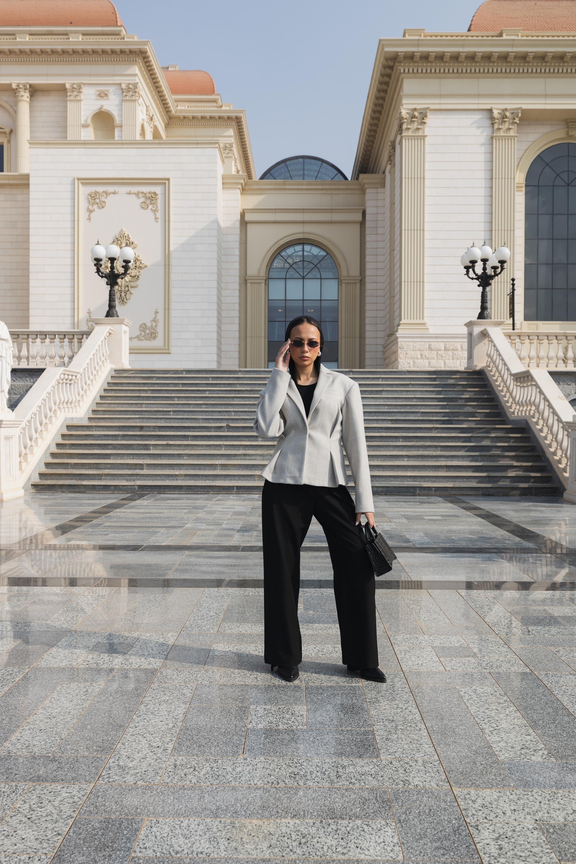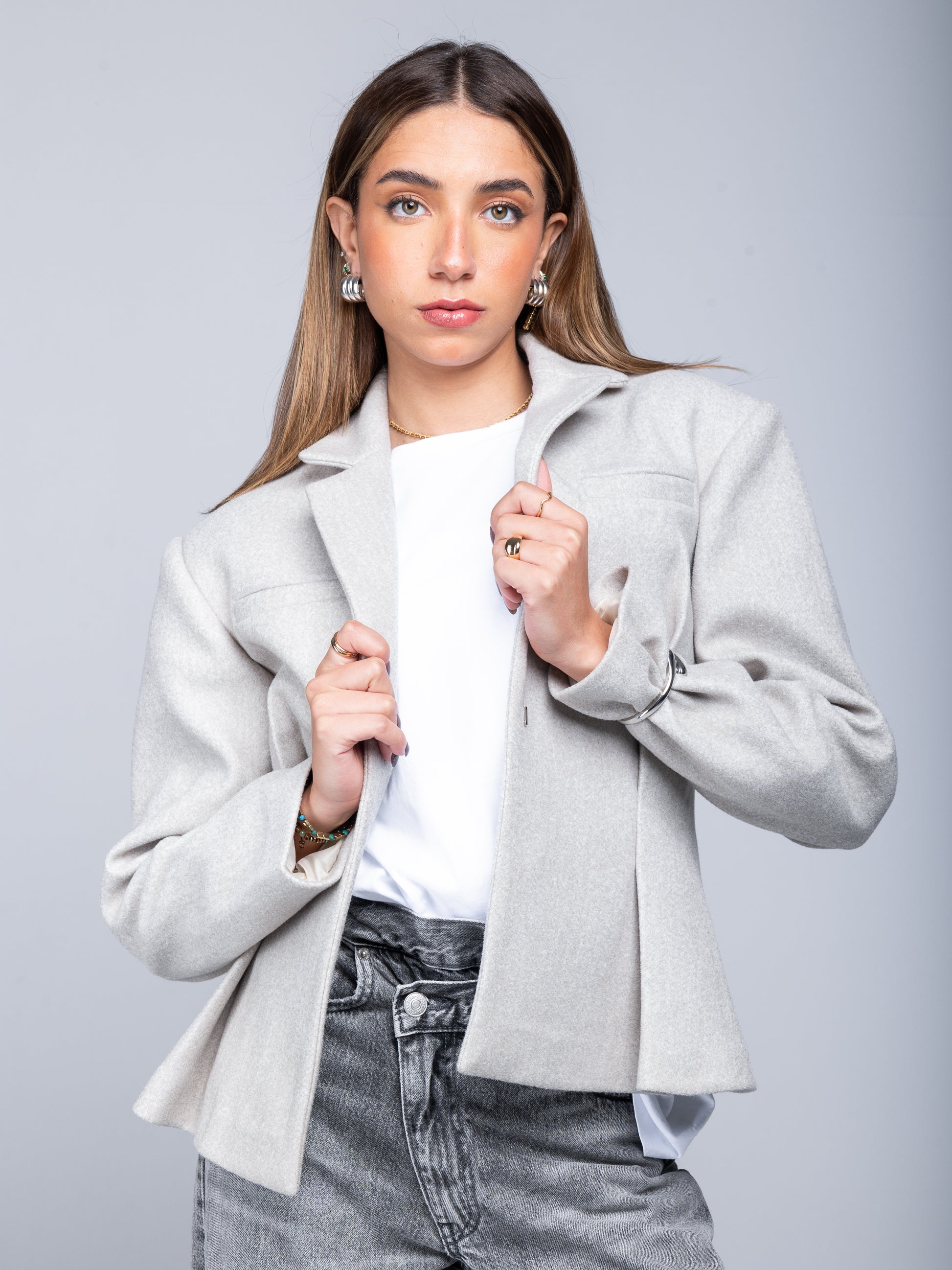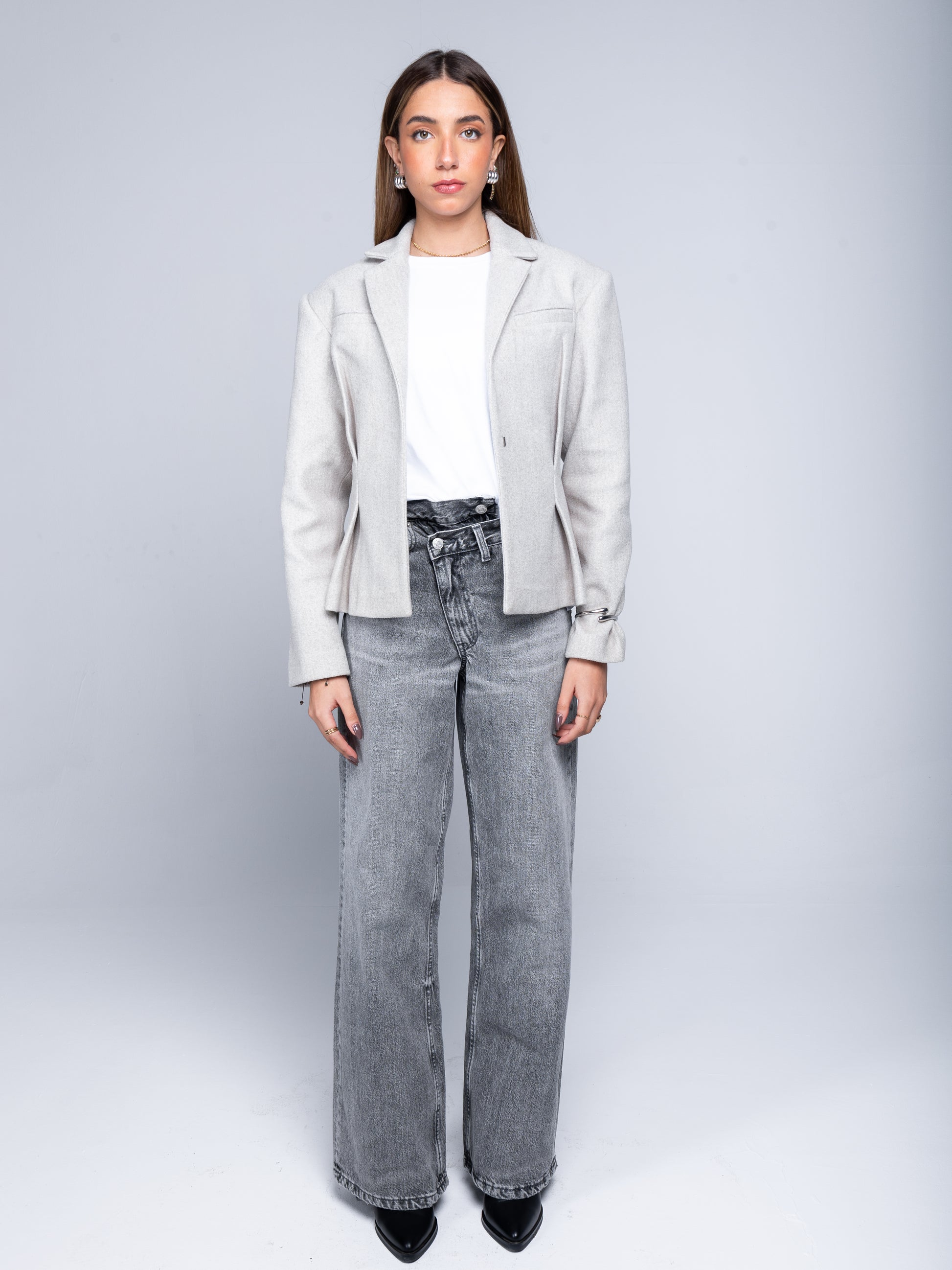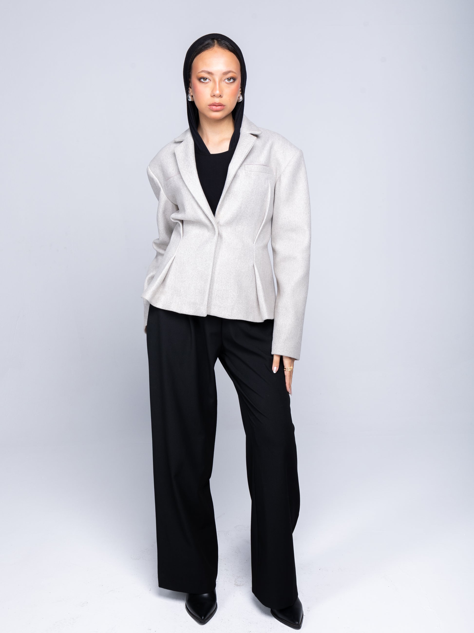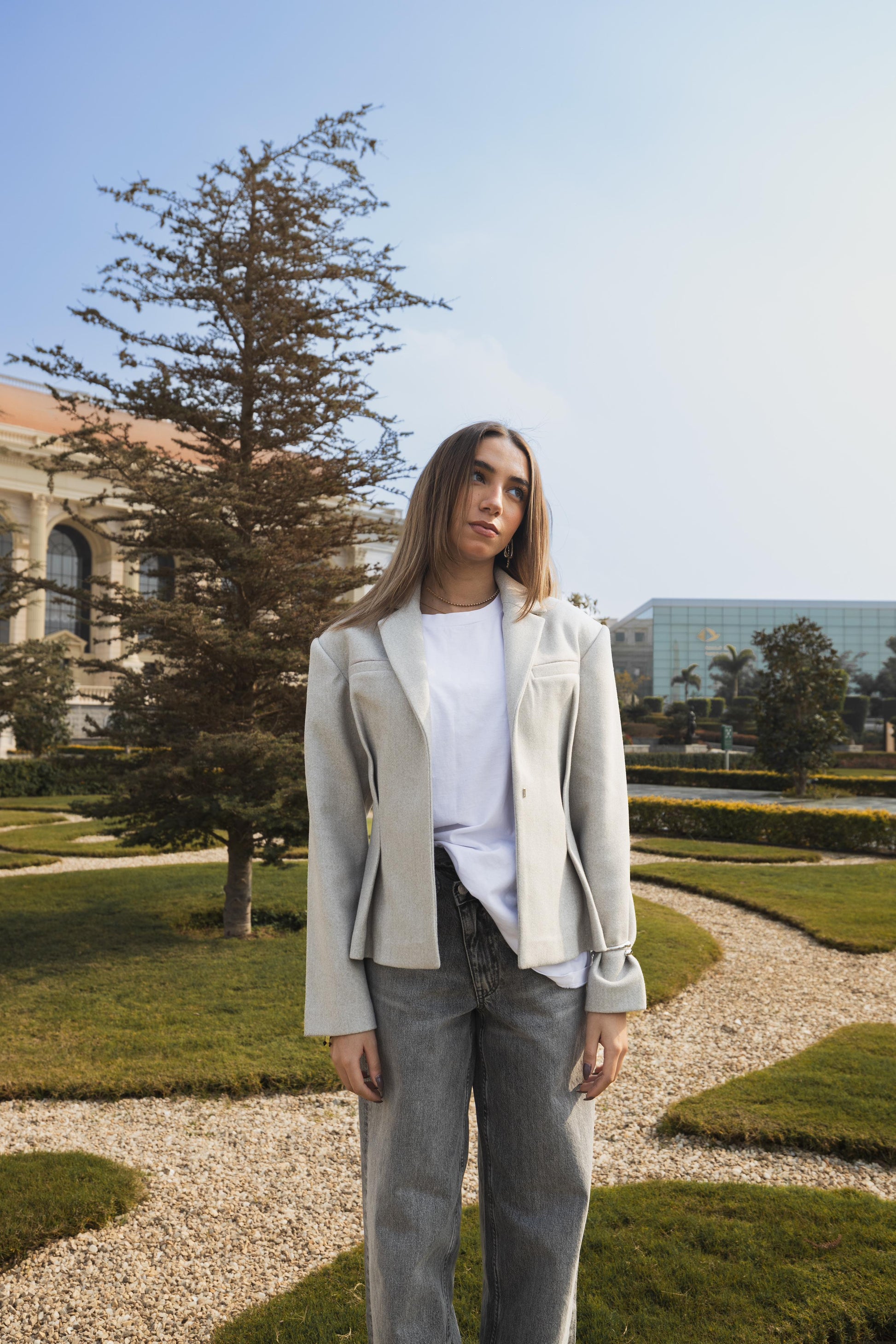 This grey blazer is a true wardrobe staple with a unique twist. The pleated sides add a modern touch, while the puffy sleeves bring an edgy, fashion-forward element to the timeless light grey color. Whether dressed up for a formal look or paired with casual pieces for a laid-back vibe, this blazer is effortlessly chic and adaptable for any occasion.