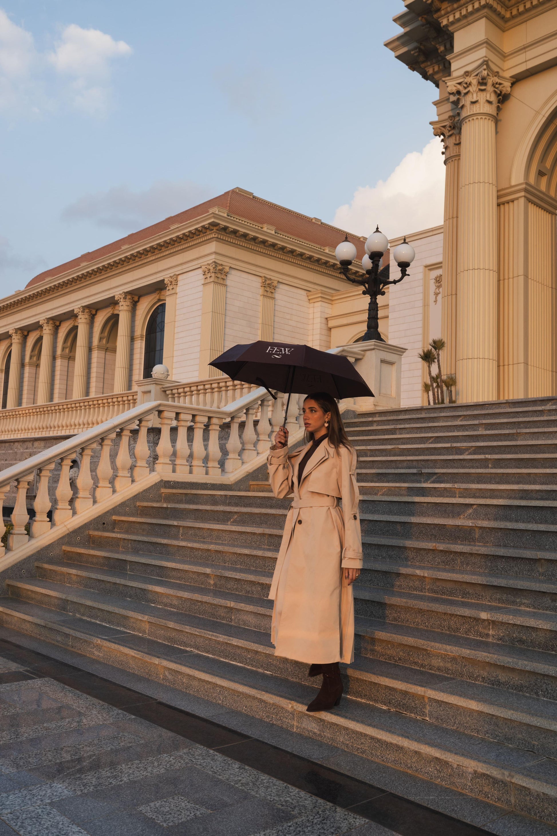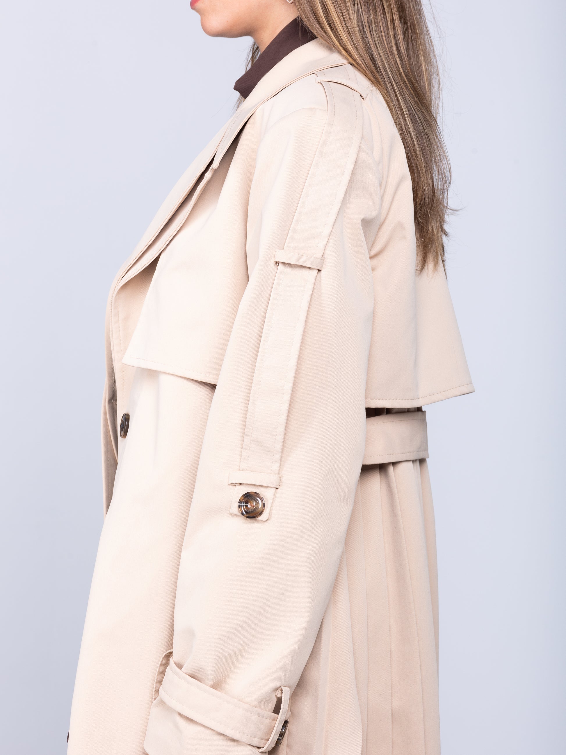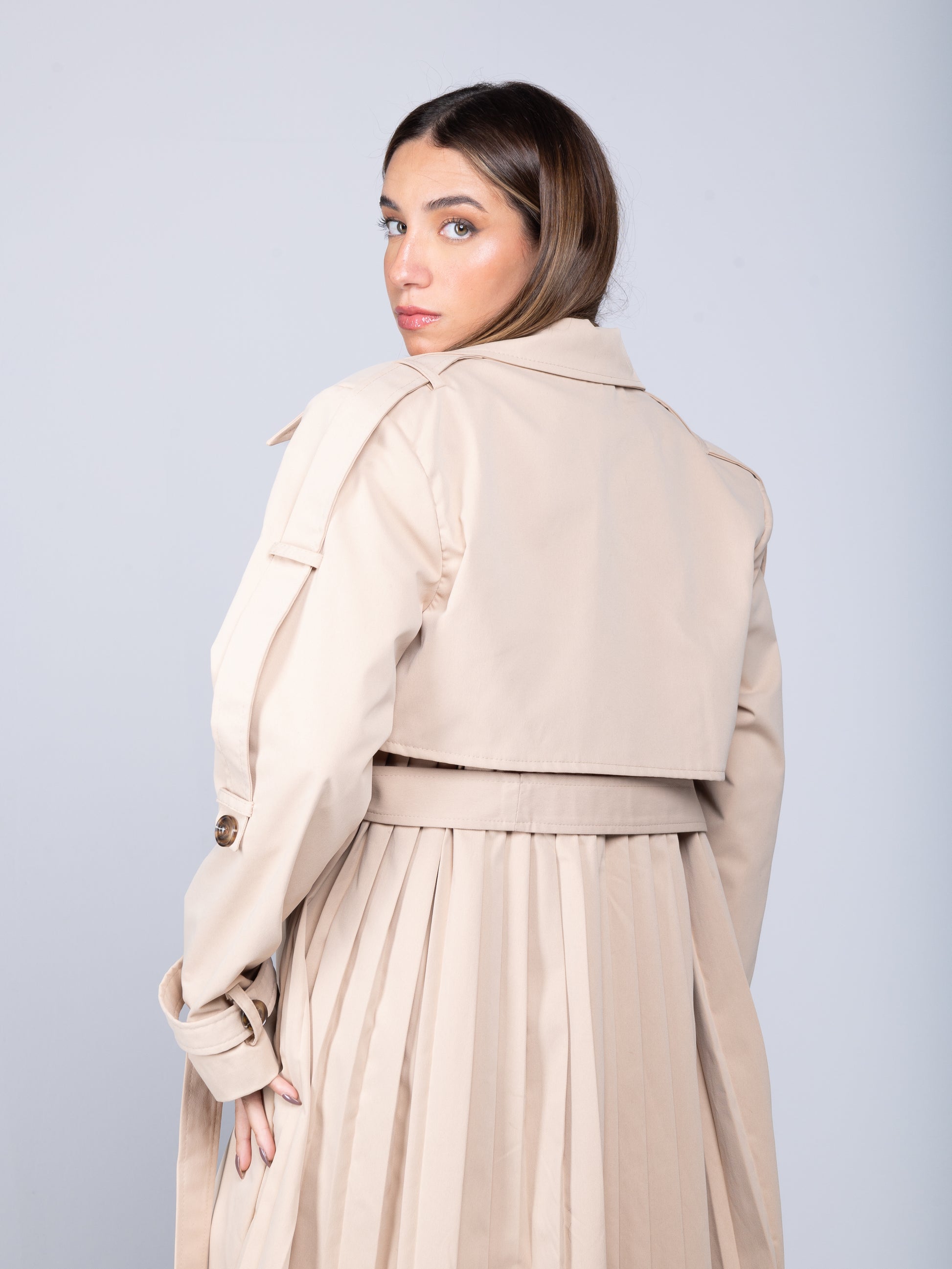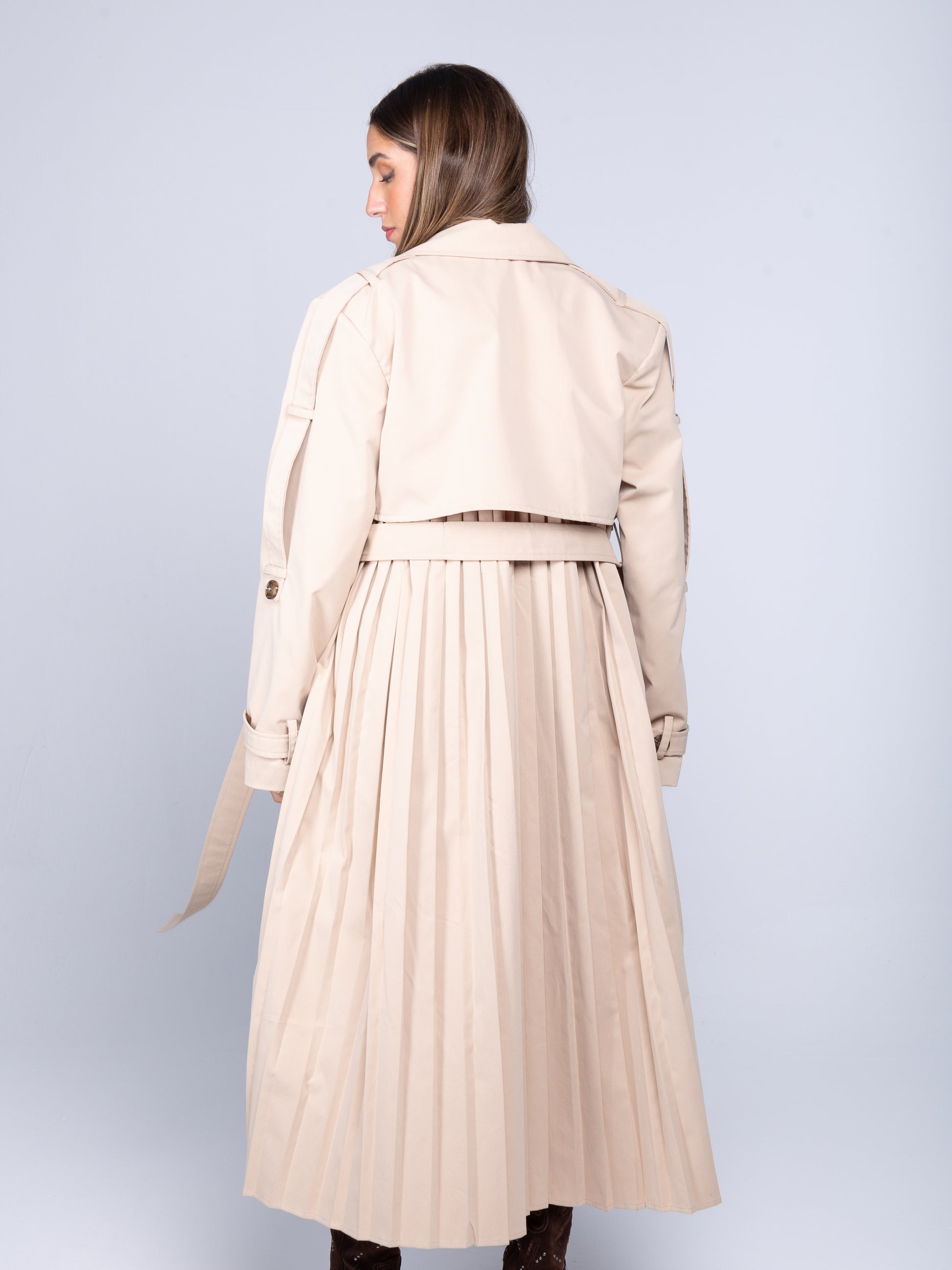 This lightweight beige trench coat takes the classic style and adds multiple modern twists. The full pleated back creates a chic, airy, and effortless look, while the bold double-layered collar brings an edgy, cool element. The belted sleeves and waist, along with resin button detailing, add the perfect finishing touches. A fresh, standout take on a timeless piece, this trench is perfect for making a statement and looking chic all year round!